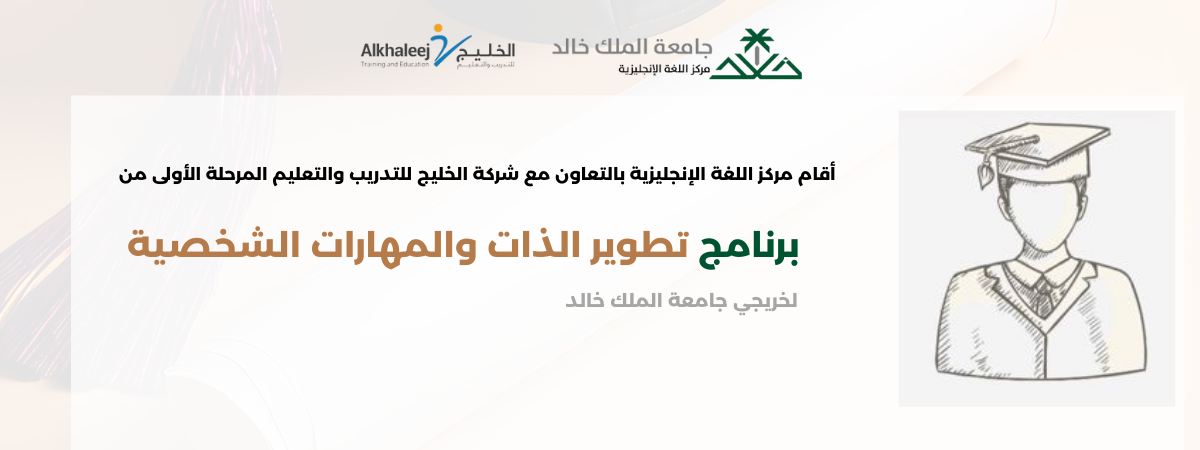 أقام مركز اللغة الإنجليزية بالتعاون مع شركة الخليج للتدريب والتعليم المرحلة الأولى من برنامج تطوير الذات والمهارات الشخصية، والذي استهدف خريجي جامعة الملك خالد، وذلك خلال الفترة من 9 إلى 11 فبراير،
